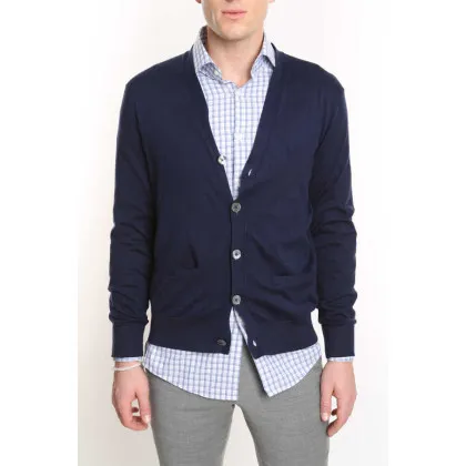 V-neck cardigan. Mother of pearl front button closure. Two dart pockets. Ribbed cuff and hem. 100% cotton. Hand wash.