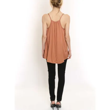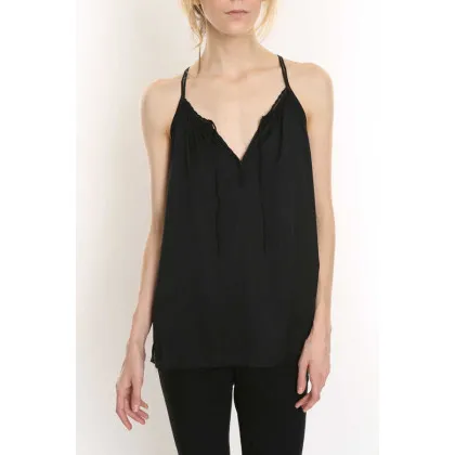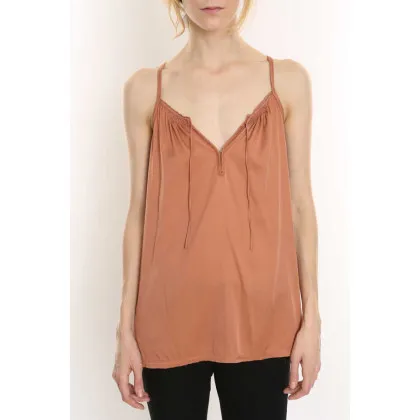 Silk cami. Tie front detail, with hook and eye. Ruched neckline. Loose through the chest and bodice. 100% Silk. Dry clean.