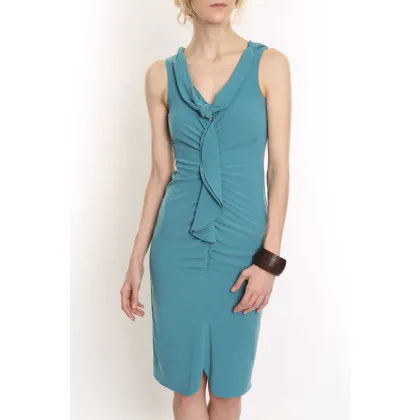 Two sash, convertible neckline with front ruffle detail. Unhemmed, visisble seams. Hidden side zipper. Unlined. Wool/elastane. Hand wash.